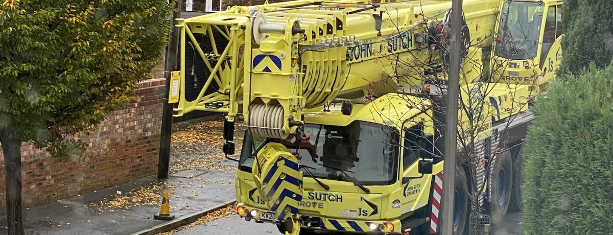 - A crane makes its way down a residential street ready for construction of the new modular building.