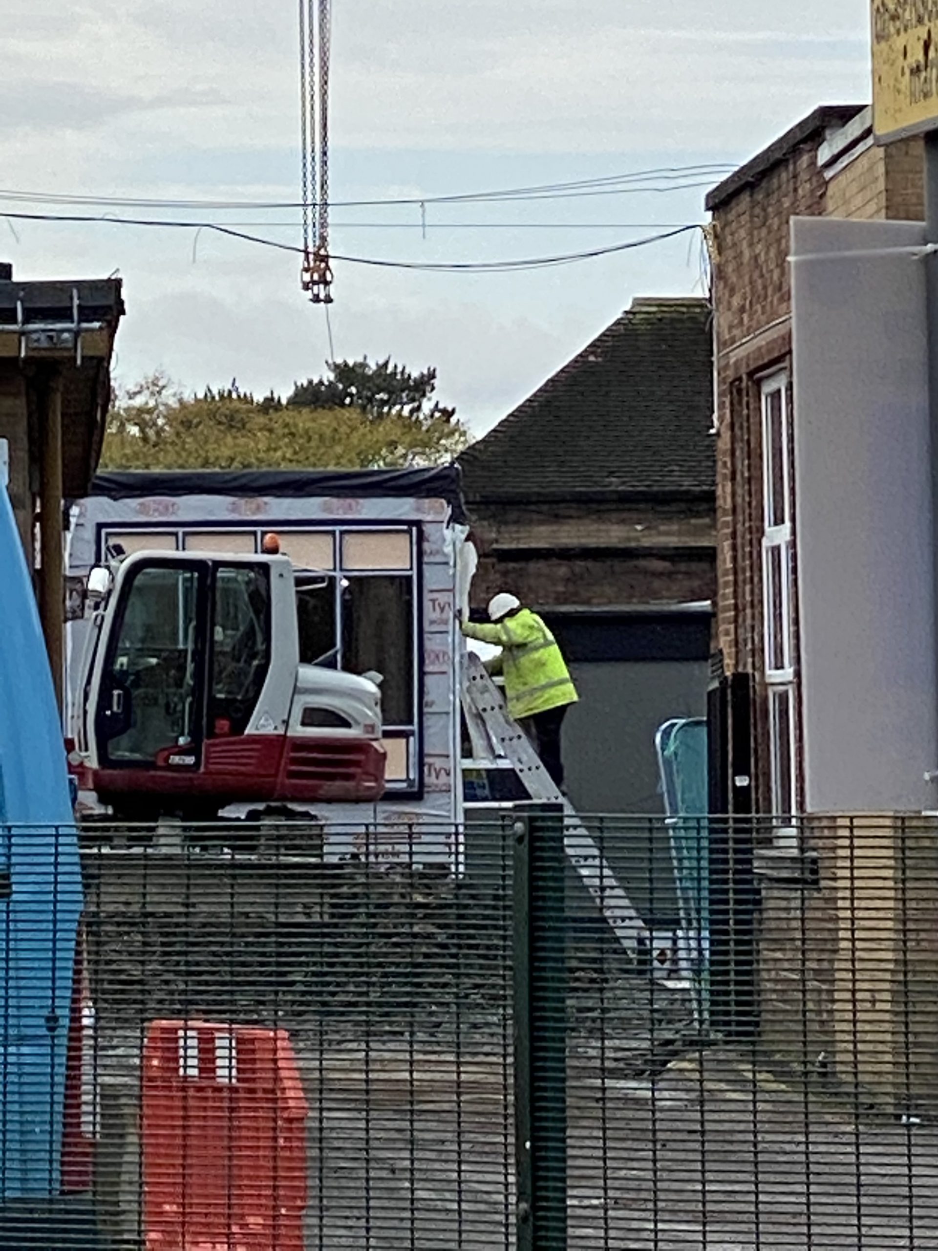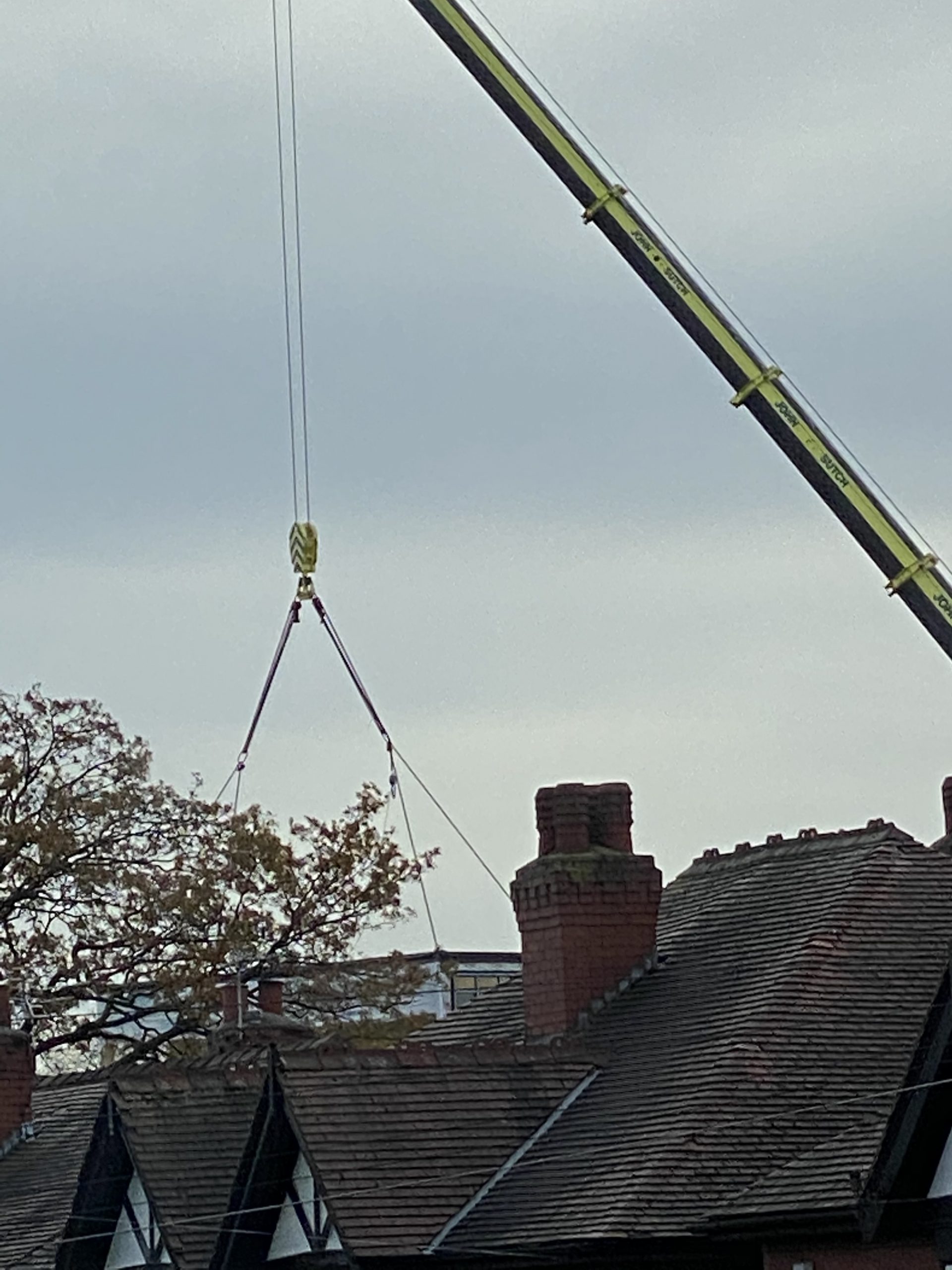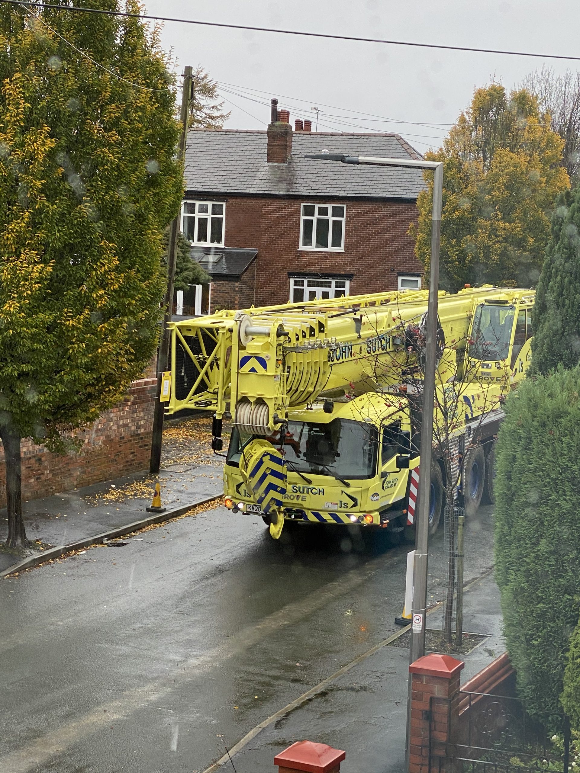 - A crane makes its way down a residential street ready for construction of the new modular building.