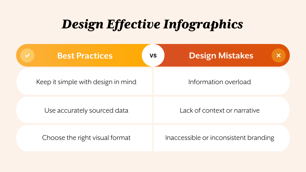 Infographics are a key element in design, so the design of it matters. Tiny text, low contrast, and overly complex visuals hinder accessibility, and if everything is the same size, colour and weight, nothing will stand out. Try to avoid cluttering the graphic, establish a clear visual path for the viewer to follow. Stick to your brand’s style guide if one exists. Read more about in Gov UK’s ‘Dos and don’ts on designing for accessibility’.